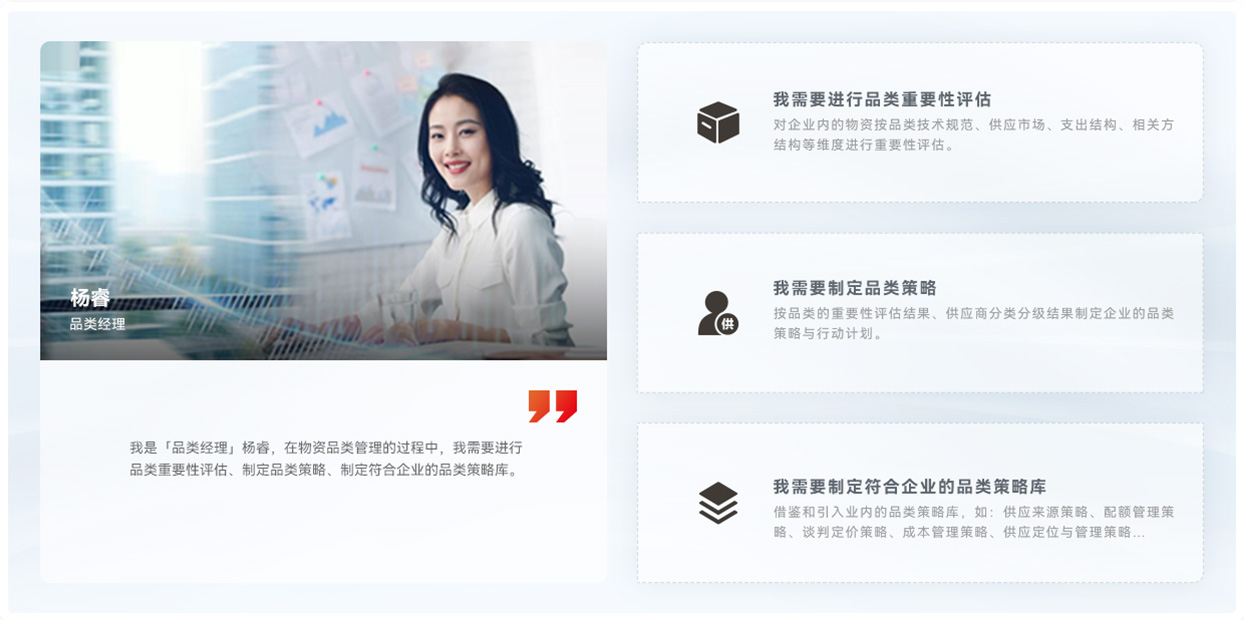 我是「品类经理」杨睿,在物资品类管理的过程中,我需要精准把控品类结构,建立基于品类的供应商管理优化体系,开发和维护多元供应渠道。