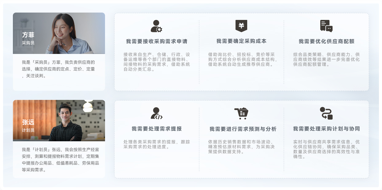 我是「计划员」张远,我会按照生产经营安排,测算和提报物料需求计划,定期集中提报办公用品、低值易耗品、劳保用品等采购需求。