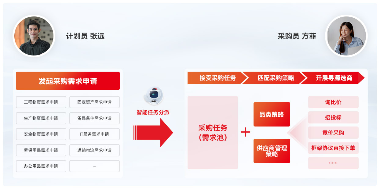 各个需求部门提交的采购申请,基于任务匹配规则,都会智能分派到统一的 “采购需求池” 中。