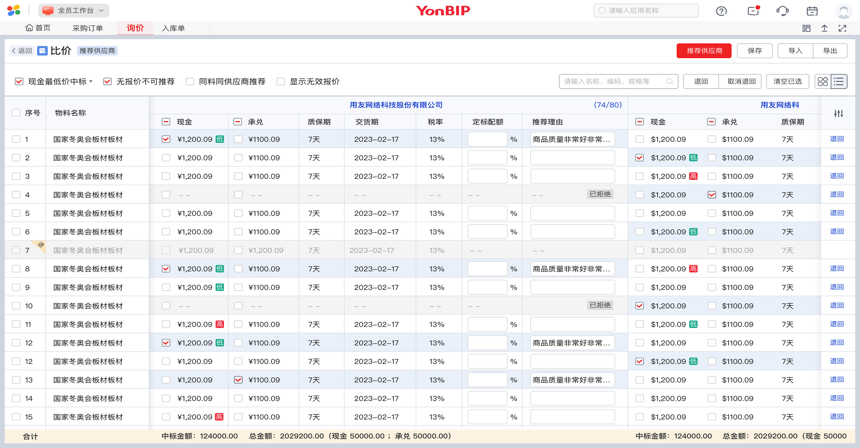 方菲在寻源业务处理过程中,借助“数智员工”的能力进行智能询比价。在询比价中,用友通过专有的“智能供应商推荐”模型,帮助企业智能确认中标供应商。