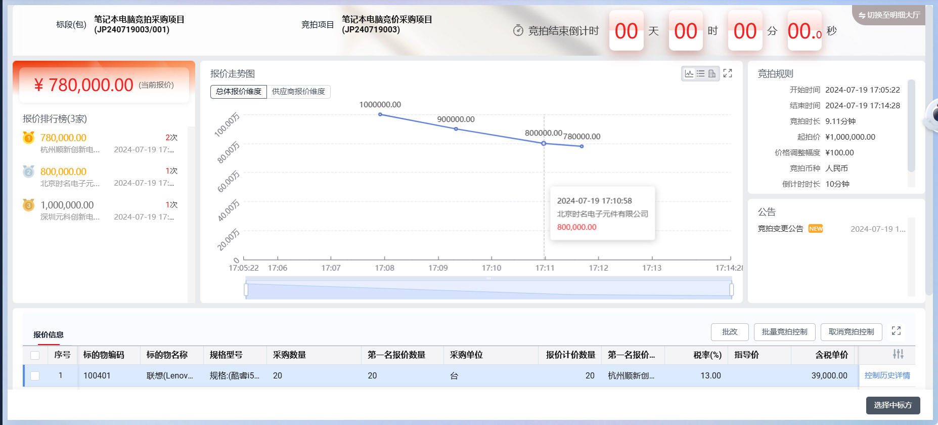 竞拍采购是个节省成本的好方法。芳菲只要在平台上设置好竞拍的时间范围等相关参数,平台就会邀请符合条件的供应商参与。供应商会在规定时间背靠背实时动态报价,她可以在平台看到供应商的每一次出价和排名。