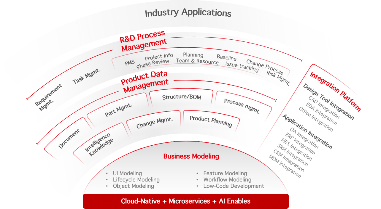 YonBIP PLM is a product lifecycle management software platform, which fully covers the needs of product innovation. PLM involves multiple sub-fields including product modeling, product data management, and R&D process management. It provides capabilities such as product requirement analysis, product data and change management, collaborative project management, design tool integration, and manufacturing integrated collaboration, thereby realizing the standardization and collaboration of R&D processes in product innovation, improving R&D efficiency and product data quality, reducing changes, and thus lowering the overall cost of enterprises and enhancing core competitiveness.