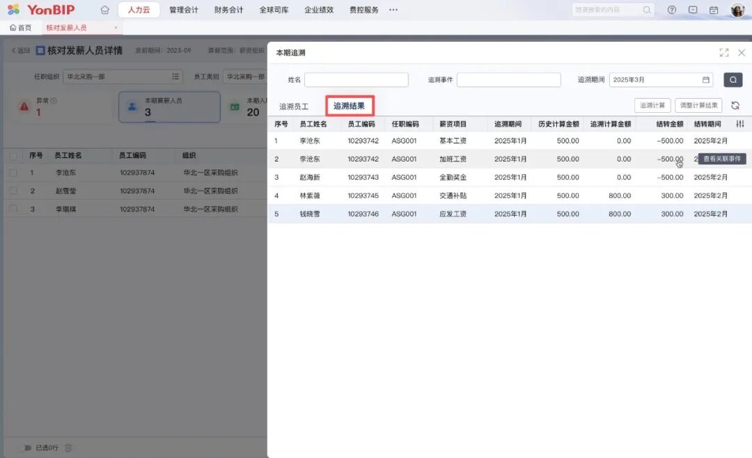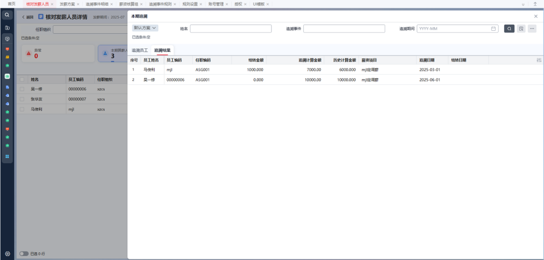系统自动对比历史与最新结果,将差额生成追溯单,并可自动结转至当前发薪周期。