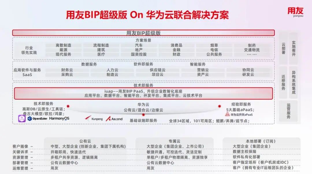 用友BIP超级版On华为云联合解决方案旨在破解企业数智化转型的核心痛点。双方深度协同:华为云提供稳定可靠的云基础设施,涵盖高性能云数据库、全球覆盖的加速网络与高合规安全防护,同时依托鲲鹏、昇腾云底座保障算力自主创新,并通过MaaS(大模型即服务)平台提供丰富模型生态与开箱即用的API能力,为上层应用筑牢技术根基;用友BIP超级版则输出行业领先的全栈SaaS服务与AI原生能力,覆盖财务、人力、供应链、制造、营销等核心业务域,以“云智一体”架构实现系统稳定安全与AI创新动能的双重保障。