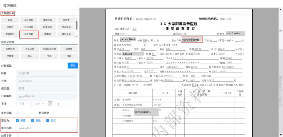 基于医疗文档模板的稳定性,点聚OFD临床文档中心具备元数据管理功能。首先设定医院元数据字段描述,然后利用版面定位技术,将元数据属性以坐标形式嵌入双层OFD文档,实现非结构化数据向结构化数据文档的转换。